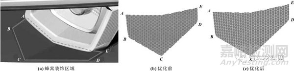 參考如下案例(圖4)來說明該方法的優化設計過程,如圖4(a)所示,多邊形ABCDE為某汽車前大燈內部飾板上的蜂窩裝飾區域,其優化前的六邊形網格排布及其邊界情況如圖4(b)所示。由于考慮到了最小可制造的網格尺寸,凡是小于一定尺寸的網孔形狀都被去除,因而在邊界上會有所殘缺,導致出現參差不齊的外觀,如圖4(b)中邊界BC、CD等。