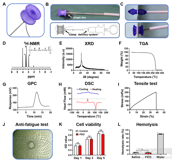 圖2:PDO封堵器的設計、性質、生物相容性。(A, B) PDO封堵器及輸送系統的設計。(C)成型線收緊前(上圖)和收緊后(下圖)封堵器釋放的形態。(D) 1H-NMR; (E) XRD; (F) TGA; (G) GPC; (H) DSC。(I)PDO單絲拉伸試驗。(J)抗疲勞試驗后PDO封堵器右側傘盤顯微圖像。(K) CCK-8測定生物相容性。(L) PDO溶血試驗。
