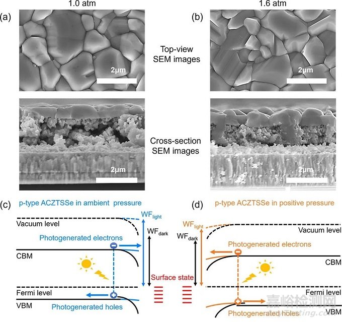 圖2 (a)對比組吸收層的SEM正面和截面圖像;(b)實驗組吸收層的SEM正面和截面圖像;(c)對比組吸收層的能帶結構;(d)實驗組吸收層的能帶結構