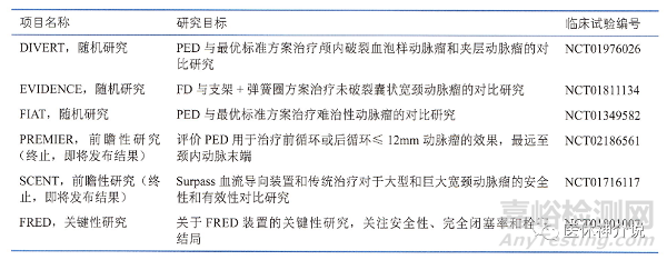 目前至少有15項FD相關的注冊研究正在進行,其中包含數個僅用于研究某一FD在特殊類型動脈瘤治療中作用的獨立上市后登記、單臂實驗。部分研究的分類總結下表: