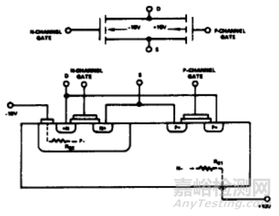圖1是一個典型CMOS輸出開關單元的電路圖及截面圖。從不同單元和區域之間的連接關系中,我們可以畫出一個等效二極管電路圖(圖2)。如果在S端或D端的模擬輸人電壓超過電源電壓。