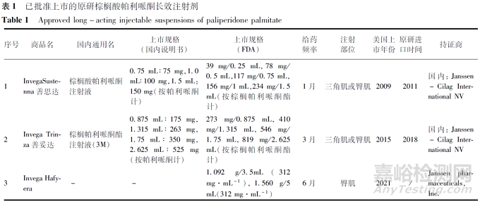 棕櫚酸帕利哌酮由楊森公司開發,目前上市原研制劑包含1月制劑(PP1M)、3月制劑(PP3M)和6月制劑(PP6M)。PP1M(商品名Invega Sustenna,NDA022264)于2009年在美國上市,上市5個規格。PP3M(商品名Invega Trinza,NDA0207946)于2015年在美國上市,上市4個規格。PP6M(商品名Invega Hafyera)于2021年在美國上市,上市2個規格(見表1)。