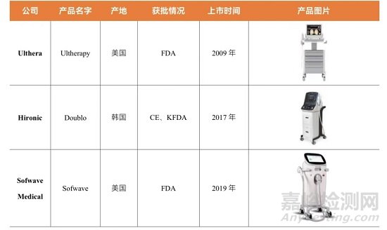 但目前,聚焦超聲產品少,且獲批困難,全球上市產品僅有三款:Ultherapy、Doublo 及 Sofwave。Ultherapy 是最早經 FDA 獲批應用于面部醫療美容的聚焦超聲產品,也是第一款上市的 MFU 產品,最早獲批應用于提拉和收緊眉毛,后獲批應用于下頜部,屬于行業標桿產品。韓國 Hironic 公司推出的 Doublo 整體設計和美版超聲刀類似,但單次能量要略遜于美版超聲,因此需要多個療程持續性治療,于 2017 年獲 CE、KFDA 認證。Sofwave 是 FDA 批準的最新緊膚療法,在表層及真皮層的作用更明顯,于 2019 年獲 FDA 批用于減少細紋和皺紋。國內尚無上市 MFU 產品,35 億元潛在市場處于虛位待補的狀態。
