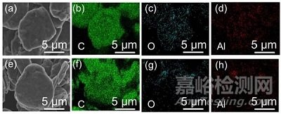 首先,作者通過sol-gel法在天然石墨(NG)表面包覆Al2O3。Sol-gel的制備方法很簡單,先向Al(NO3)3·9H2O中加入去離子水,隨后在攪拌條件下加入天然石墨,最后干燥得到表面包覆Al2O3的天然石墨AN-1 (氧化鋁包覆量1 wt%)和AN-3 (氧化鋁包覆量3 wt%)。NG、AN-1和AN-3的SEM圖像如圖1所示,三者的粒徑分別約11.55 μm、11.58 μm和11.67 μm。從圖1和圖2可以看出,通過sol-gel方法在天然石墨表面包覆的Al2O3是較為均勻的,但天然石墨顆粒并未實現完整包覆,而是存在相當部分的裸露區域。