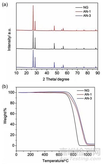 AN-1和AN-3的XRD圖譜同NG幾乎一致,并未顯示出Al2O3的存在,這主要是Al2O3包覆量太少所致。但TGA曲線可以明顯看到900 ℃時NG燃燒殆盡而AN-1和AN-3依然還存在質量,該質量同二者的Al2O3量相一致。