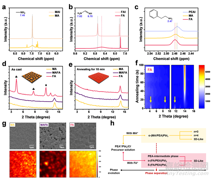 圖2. (a-c) 核磁共振氫譜,(d) 未退火鈣鈦礦薄膜的X射線衍射圖,(e) 退火后鈣鈦礦薄膜的X射線衍射圖,(f) 不同退火時間下的X射線衍射圖,(g) 掃描電子顯微鏡的平面圖和二維熒光圖,(h) 結晶路線示意圖。