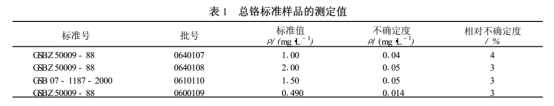 表 1 為總鉻標準樣品的標準值、不確定度和相對不確定度。