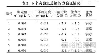 表2為6個實驗室同時測定總鉻的情況,經Grubbs檢驗無異常數據。其中用于能力驗證檢測的樣品由上級實驗室采用總鉻標準溶液配制。