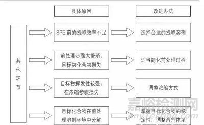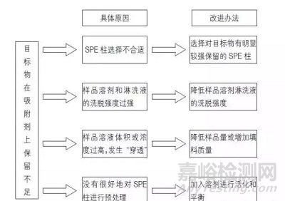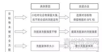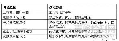 首先確定目標化合物存在于哪一部分,進而確定問題來自下列哪一環節:目標化合物在吸附劑上保留不足;目標化合物未被完全洗脫;其他環節。