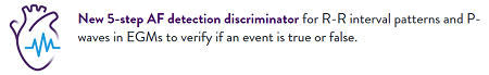 具有新的5步房顫檢測鑒別器,用于檢測心電圖中的R-R間隔模式和P波,以驗證事件是真是假。