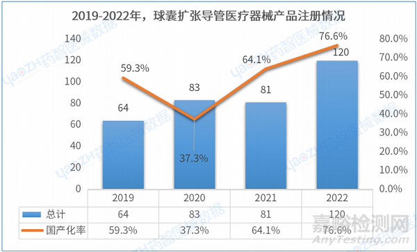 截至2023年5月,球囊擴(kuò)張導(dǎo)管醫(yī)療器械產(chǎn)品在有效期內(nèi)產(chǎn)品注冊總數(shù)為398件。其中,國產(chǎn)產(chǎn)品有253件,占比63.5%。2019-2021年注冊數(shù)量總體呈上升趨勢,國產(chǎn)注冊產(chǎn)品也在逐漸增多,2022年國產(chǎn)占比率達(dá)到了76.6%。