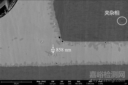 通過使用掃描電鏡(SEM)+能譜(EDS)分析,發(fā)現(xiàn)銀-錫膏和銅面結(jié)合,界面有銅-錫為主合金化晶粒生長,銅引腳有鍍鎳層,并在正常區(qū)存在氣孔和大量的鐵富集相夾雜。
