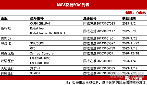 創(chuàng)造了很多奇跡的ECMO如今已經(jīng)拓展了更多的應(yīng)用場(chǎng)景,我國(guó)ECMO技術(shù)也已逐步實(shí)現(xiàn)諸多突破。截至2023年5月10日,NMPA數(shù)據(jù)顯示有7家企業(yè)共9款ECMO注冊(cè)證在有效期內(nèi)。