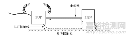從圖中我們可以看出, 電源線、EUT、LISN、EUT接地線以及參考接地板之間形成了一個較大的環路。