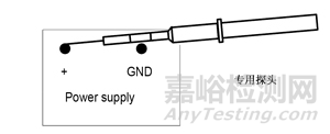 圖5所示為一種專用示波器探頭直接與波測電源靠接。專用示波器探頭上有個(gè)地線環(huán),其探頭的尖端接觸電源輸出正極,地線環(huán)接觸電源的負(fù)極(GND),接觸要可靠。