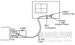 為滿足第1條要求,測量連線應(yīng)盡量短,并采用雙絞線(消除共模噪聲干擾)或同軸電纜;一般的示波器探頭不能用,需用專用示波器探頭;并且測量點(diǎn)應(yīng)在電源輸出端上,若測量點(diǎn)在負(fù)載上則會(huì)造成極大的測量誤差。為滿足第2點(diǎn),負(fù)載應(yīng)采用阻性假負(fù)載。