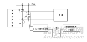 國家標(biāo)準(zhǔn)規(guī)定在被測電源輸出正、負(fù)端小于150mm處并聯(lián)兩個(gè)電容C2及C3,C2為22μF電解電容,C3為0.47μF薄膜電容。在這兩個(gè)電容的連接端接負(fù)載及不超過1.5m長的50Ω同軸電纜,同軸電纜的另一端連接一個(gè)50Ω的電阻R和串接一個(gè)4700pF的電容C1后接入示波器,示波器的帶寬為100MHz。同軸電纜的兩端連接線應(yīng)盡可能地短,以防止撿拾輻射的噪聲。另外,連接負(fù)載的線若越長,則測出的紋波和噪聲電壓越大,在這情況下有必要連接C2及C3。若示波器探頭的地線太長,則紋波和噪聲的測量不可能精確。