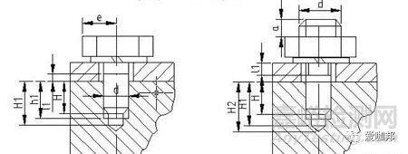 螺釘連接如圖a所示,這種連接的特點是螺釘直接擰入被連接的螺紋孔中,不用螺母,結構比較單、緊湊,使用于結構不能采用螺栓連接的所合,螺釘連接不宜用在采力大或經常拆裝的場合,如果經常拆裝,易使螺紋磨損,可能導致被連接件報廢,如果要經常拆裝,則可采用雙頭螺栓連接,如圖b,擰入深度為H,當螺孔為鋼或者為表鋼時,H≈d;當螺孔為鑄鐵時,H=(1.25~1.5)d,當螺孔為鋁合金時,H=(1.5~2.5)d,螺紋孔H1=H+(2~2.5)p(p為螺紋螺距),鉆孔深度H2=H1+(0.5~1)d 。