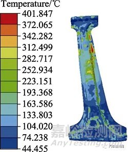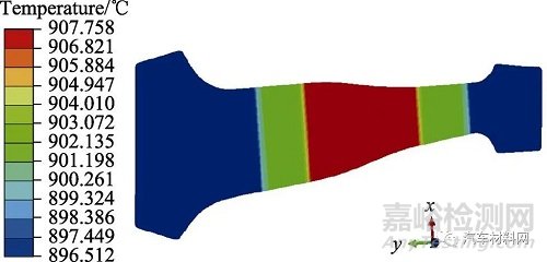 如圖17所示,成形件端部的應(yīng)力值分布不均勻,兩側(cè)應(yīng)力值大,中間應(yīng)力值小。這主要是因?yàn)槎瞬康臏囟炔痪鶆蛟斐傻?,在成形件兩?cè)不僅通過模具換熱,還通過熱輻射向四周散熱,如圖18所示,端部?jī)蓚?cè)的溫度比中心位置低,由此可見,在熱成形中,板材溫度的變化對(duì)熱成形的應(yīng)力分布有較大影響。