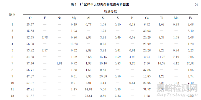 將大樣電解后的夾雜物置于掃描電鏡(SEM)下觀察,并對夾雜物進行能譜分析。1#試樣中大型夾雜物SEM形貌如圖3所示,選取12處夾雜物進行能譜分析,結果如表3所示。