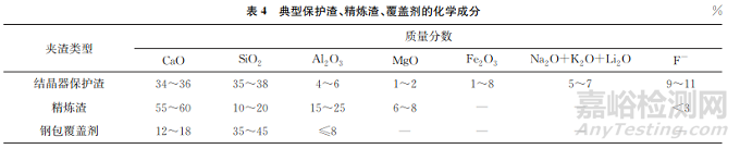 測點1,3,5,6,7,10中的夾雜物存在較為明顯的共同特征,均含有K元素或F元素,該類元素常見于各類夾渣中,一般認為K元素是結晶器保護渣中的特征元素。典型保護渣、精煉渣、覆蓋劑的化學成分如表4所示。