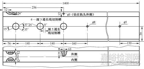 該測試軌一套兩塊,分為A型和B型。測試軌的長度 1.4 m,加工時A型和B型兩根軌配套成一個自然鋼軌接頭,各種人工缺陷的方向及位置以軌縫為中心左右對稱,其中軌頭橫孔,一根加工在外側(A型),另一根加工在內側(B型),它除了保持GTS-60試塊的作用外,還具有以下作用: