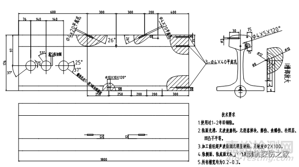 ④軌端部增加三個Φ4 mm平底孔,用于校驗焊縫探傷(單、雙探頭法)靈敏度。