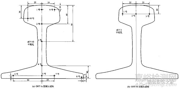 ②軌腰內增加了和標準孔位等高的8橫通孔,用于雙45°探頭穿透探傷靈敏度的校驗。