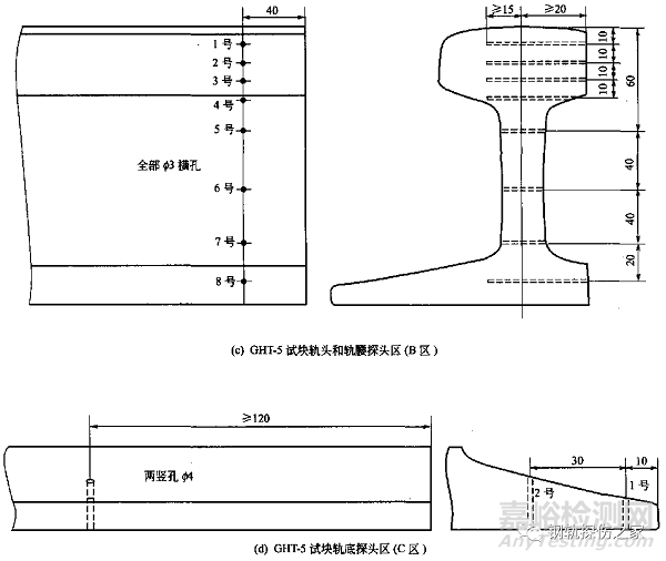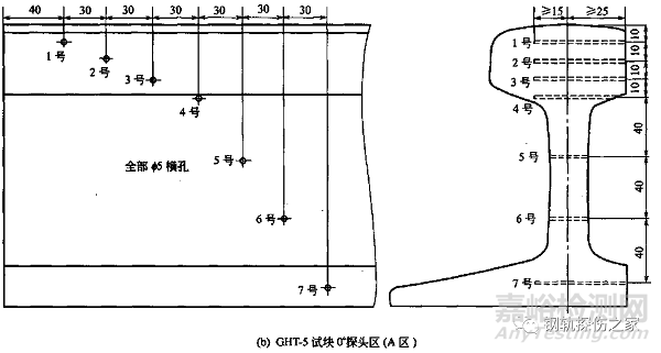 ①軌頭中設有φ4平底孔和φ3橫孔,兩者都是檢驗70°探頭的探測性能。