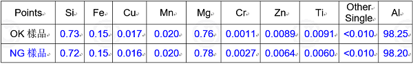 采用火花原子光譜儀對其基材進行化學成分分析,結(jié)果見表1;NG樣品與OK樣品基材化學成分均為6系鋁合金,兩者差異較小。