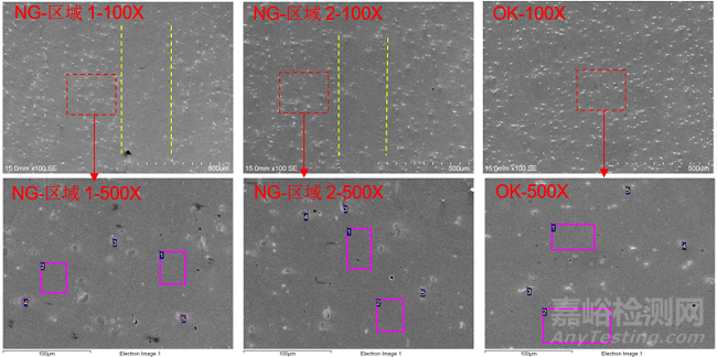 1.研磨拋光后,在NG樣品區(qū)域1和區(qū)域2均可見條帶存在,條帶區(qū)域顆粒物較少,而其兩側(cè)顆粒物較多,條帶寬度與SEM所觀察異色線寬度相符;