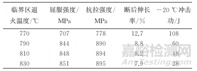 表1 淬火+不同臨界區溫度退火+回火后試驗鋼的力學性能