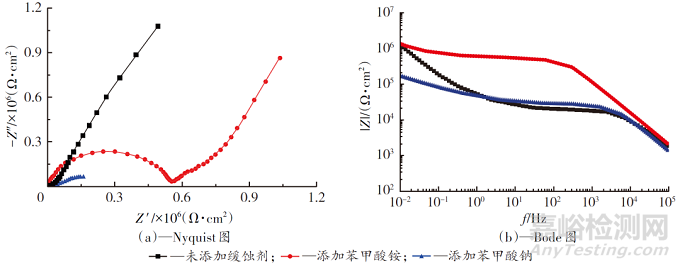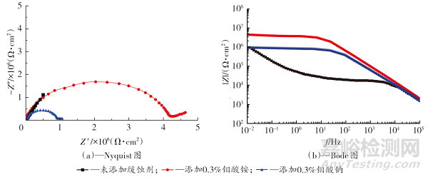 圖8是添加了上述比例緩蝕劑的漆膜在鹽水中浸泡72 h后測得的電化學阻抗譜。