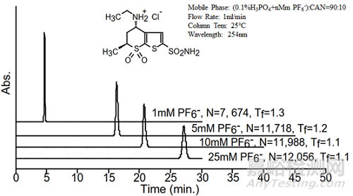 嘗試用不同摩爾濃度的六氟磷酸根進行鹽酸多佐胺的分析時[2],發現隨著六氟磷酸根濃度的增加行鹽酸多佐胺的保留時間顯著增加,且鹽酸多佐胺的對稱性及理論板數也同步增加,如圖3所示。
