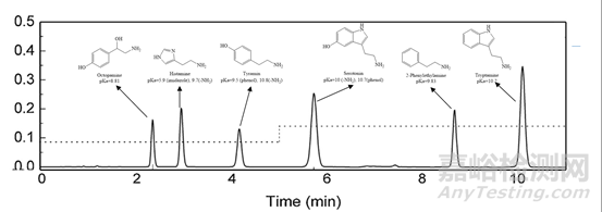 嘗試用含50mM六氟磷酸根的酸性流動相,對6種堿性毒性生物胺進行反相分離[3],六種質子化毒性生物胺均得到了有效保留,且實現了良好的RP-HPLC分離,如圖4所示。