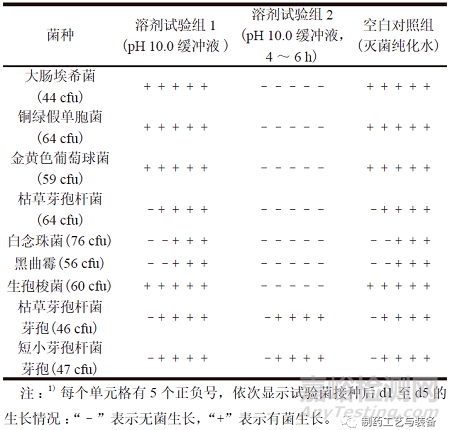 取“2.2”項下pH 10.0 緩沖液適量,依照ChP2020 通則1101,分別加入不大于100 cfu 的各試驗菌,混勻。將含有大腸埃希菌、銅綠假單胞菌、金黃色葡萄球菌和生孢梭菌的混合溶液轉移至FTM培養基50 ml 中,于33 ℃培養不少于5 d ;將含有枯草芽孢桿菌、白念珠菌、黑曲霉、枯草芽孢桿菌芽孢和短小芽孢桿菌芽孢的混合溶液轉移至TSB培養基50 ml 中,于23 ℃培養不少于5 d。同時,為確證pH 10.0 緩沖液中試驗菌株的穩定性,另取適量pH 10.0 緩沖液,加入試驗菌后,置45 ℃、120 r/min 的恒溫搖床中孵育4 ~ 6 h,然后分別轉移至不同培養基,觀察菌株生長情況。將上述采用新鮮配制pH 10.0 緩沖液的試驗組作為溶劑試驗組1,采用經孵育4 ~ 6 h 的pH 10.0 緩沖液的試驗組作為溶劑試驗組2。