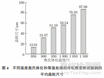 由圖4可知,冷軋預(yù)變形試驗(yàn)鋼的平均晶粒尺寸隨奧氏體化溫度的升高而增大,這可能與鋼中第二相粒子溶解造成對(duì)奧氏體晶粒粗化的抑制作用減弱有關(guān)。