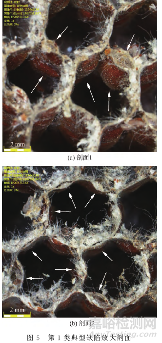 從圖4中可看出缺陷位置處的蜂窩格孔發生變形,不再是標準的六邊形,蜂窩壁發生彎曲,有的表現為蜂窩壁分離,但與鼓泡的圓弧形缺陷不同的是,該處蜂窩壁分離部位凸起更為尖銳。再結合圖4中蜂窩格孔變形而非節點分離的結果可知,此類缺陷不再是鼓泡缺陷,而是蜂窩塌陷缺陷,將此類缺陷定義為第2類典型缺陷,其缺陷位置也與典型件穿透法超聲C掃描圖像(圖1(A)典型件2)中疑似缺陷位置吻合。部分穿透法超聲C掃描超聲衰減大的典型件采用X-CT檢測也未發現缺陷,故解剖典型件研究典型件缺陷。