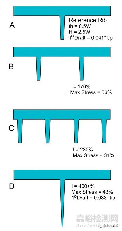 圖A為參考加強筋的側視圖(壁厚 = W,筋骨厚度 = th,筋骨高度 = H)。加強筋厚度遵循高收縮材料 (0.5W) 的準則,每側具有 1° 拔模斜度。請注意,此拔模將加強筋頂端處的厚度減少至 0.041 英寸。BCD三種替代筋設計策略被證明可以增加結構的剛度。顯示了這些替代設計的轉動慣量 (I) 的近似增加(I 是結構剛度的度量)。還顯示了這些加強筋中的每一個相對于參考加強筋所經歷的最大應力,該應力在負載與參考的情況下會產生。(設計 B 會將參考設計中的最大應力降低至 56%,設計 C 降低至 31%,設計 D 降低至 43%。)