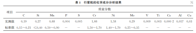 在行星輪內孔處取樣,對其進行化學成分分析,結果如表1所示,可見該行星輪的化學成分符合GB/T 3077—1999《合金結構鋼》對18CrNiMo7-6鋼的要求。