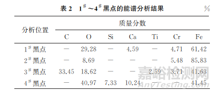 采用SEM對黑點進行觀察,結果如圖2所示。對黑點進行能譜分析,分析位置如圖2所示,分析結果如表2所示,可見黑點主要含有O、Mg、Al、Ca、Mn、S等元素。