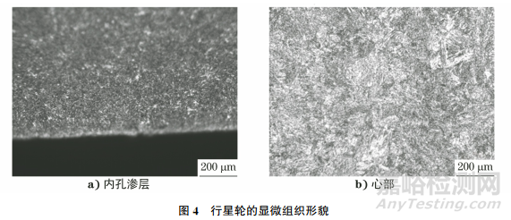 在行星輪內孔處截取試樣,將試樣進行磨制、拋光、腐蝕處理,然后用光學顯微鏡對其進行觀察,結果如圖4所示,可見內孔滲層組織為細針狀馬氏體+少量殘余奧氏體,心部組織為貝氏體+馬氏體。