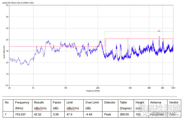 通過實驗室復測,可以測到接近148.5MHz、594MHz以及742.5MHz頻率點,其中742.5MHz頻點超了1.65個dB,考慮到試驗場地以及客戶已經做過整改,數據會存在一些差異。