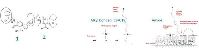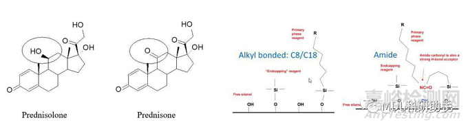 再看看酰胺固定相,酰胺固定相上存在氮,可以形成氫鍵,因此酰胺固定相將與極性化合物Prednisolone和Prednisone相互作用。Prednisolone具有與氧一起可用的氫,但在Prednisone的情況下,該氫缺失或共享,因此該羥基可以與酰胺固定相有更多的相互作用。由于目標化合物和固定相都有較強的極性,因此,化合物將有更好的保留,但由于氫鍵的形成,Prednisolone具有更強的保留,因此,可以考慮采用酰胺固定相來進行分離。