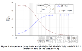 對(duì)比限值可以看出電壓法與電流法限值在頻段和等級(jí)劃分是一致的,僅量綱不同和數(shù)值不同。由于測(cè)試在50Ω系統(tǒng)下進(jìn)行,因此電壓量綱與電流量綱之間固定存在34dB差值(50歐電阻對(duì)數(shù)形式34dBΩ),與6MHz之后限值差值是一致的。而6MHz之前的差值小于34dB,通過查詢基礎(chǔ)標(biāo)準(zhǔn)的阻抗值我們能發(fā)現(xiàn)是由于阻抗差異導(dǎo)致而非測(cè)試方法嚴(yán)酷程度不同。參考基礎(chǔ)標(biāo)準(zhǔn)CISPR16-1-2中車標(biāo)150KHz-108MHz 50Ω/5uH+1Ω人工電源網(wǎng)絡(luò)AMN相應(yīng)的阻抗曲線如下 :