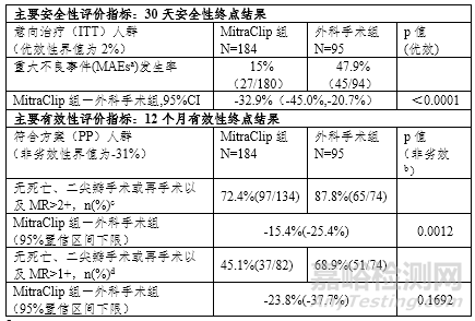根據FDA公開的審評信息,盡管RCT研究證實MitraClip System可以被安全植入并降低大部分患者的二尖瓣反流,但有效性不及外科手術(具體臨床試驗結果見表1),因此該臨床研究不足以支持MitraClip System在手術候選人群中使用。