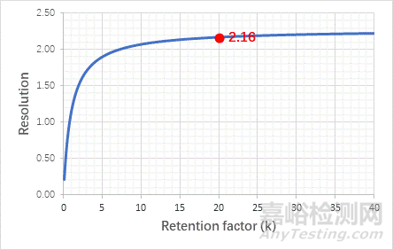 由圖3可知,當保留因子K≤5時,通過改變K值,分離度都能得到極大的改善。當保留因子K≥10,通過改變K值,分離度得到的改善卻極小。因此,方法開發過程中,如果色譜峰的保留因子K≤5,此時通過改變K值便能有效的改善分離。如果色譜峰的保留因子K≥10,此時通過改變保留因子K將會收效甚微。因此當保留因子K≥10時,改變其他參數將會更加有效。