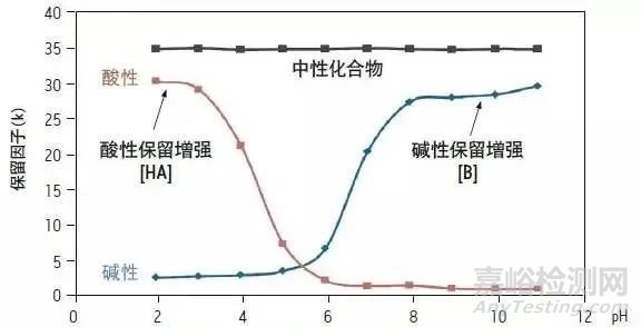 當分析物含有可電離官能團時(可電離官能團指,在不同的pH條件下可處于不同程度的電離狀態,例如:伯/仲/叔胺基、羧酸基、酚酸基),pH條件將強烈影響分析物的反相保留效果,pH條件的改變也會造成最強烈的選擇性改變效果。酸性和堿性化合物在其未電離狀態下時反相保留最大,中性化合物的保留不受pH影響。
