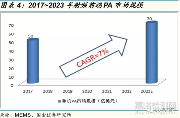 5G 手機功率放大器(PA)用量翻倍增長:PA 是一部手機最關鍵的器件之一,它直接決定了手機無線通信的距離、信號質量,甚至待機時間,是整個射頻系統中除基帶外最重要的部分。手機里面 PA 的數量隨著 2G、3G、4G、5G 逐漸增加。以 PA 模組為例,4G 多模多頻手機所需的 PA 芯片為5-7 顆,預測 5G 手機內的 PA 芯片將達到 16 顆之多。