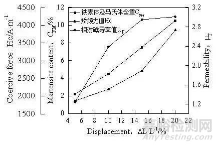 由沖擊法測試結果可以看出,當奧氏體不銹鋼發生塑性變形后,材料的磁特性發生變化,伴隨著磁導率和矯頑力的增大,非鐵性奧氏體不銹鋼開始具有鐵磁性材料的某些特性。